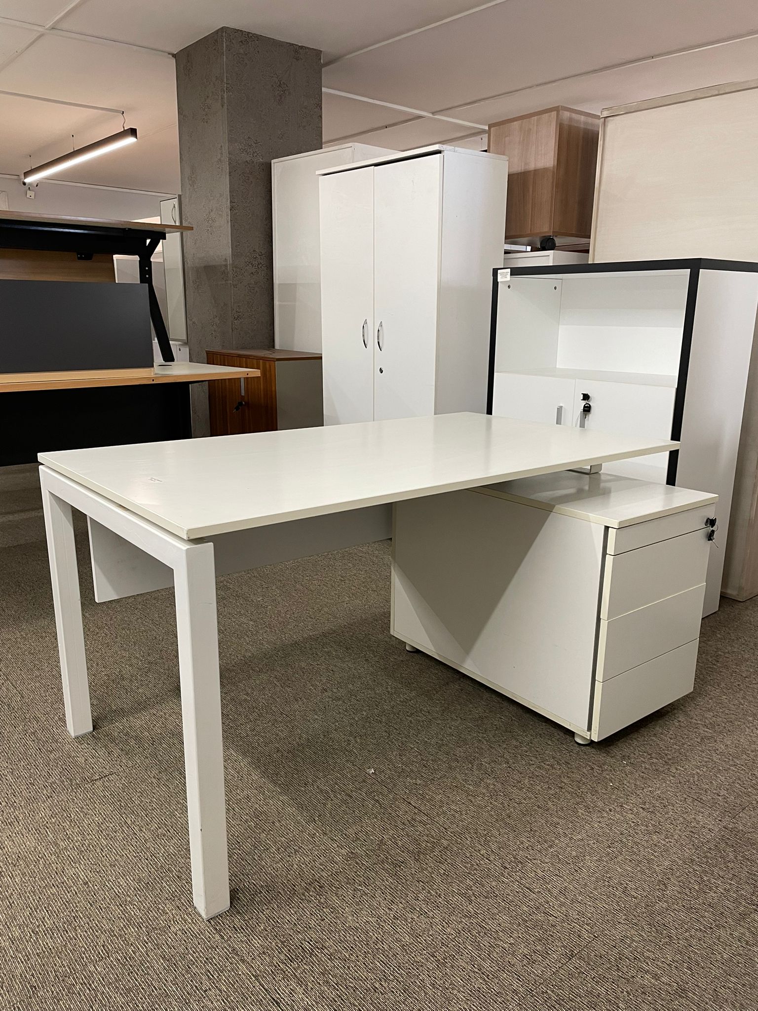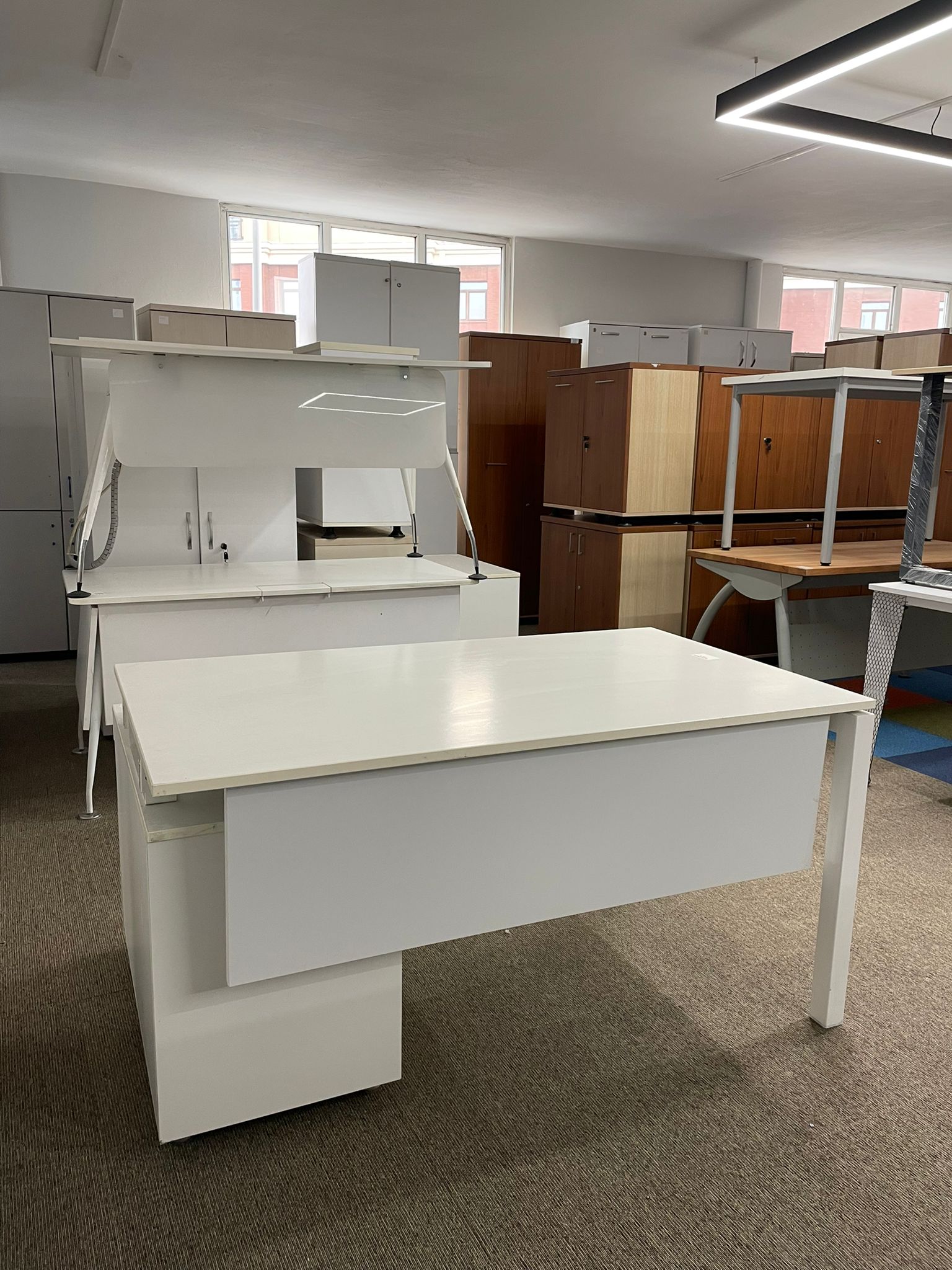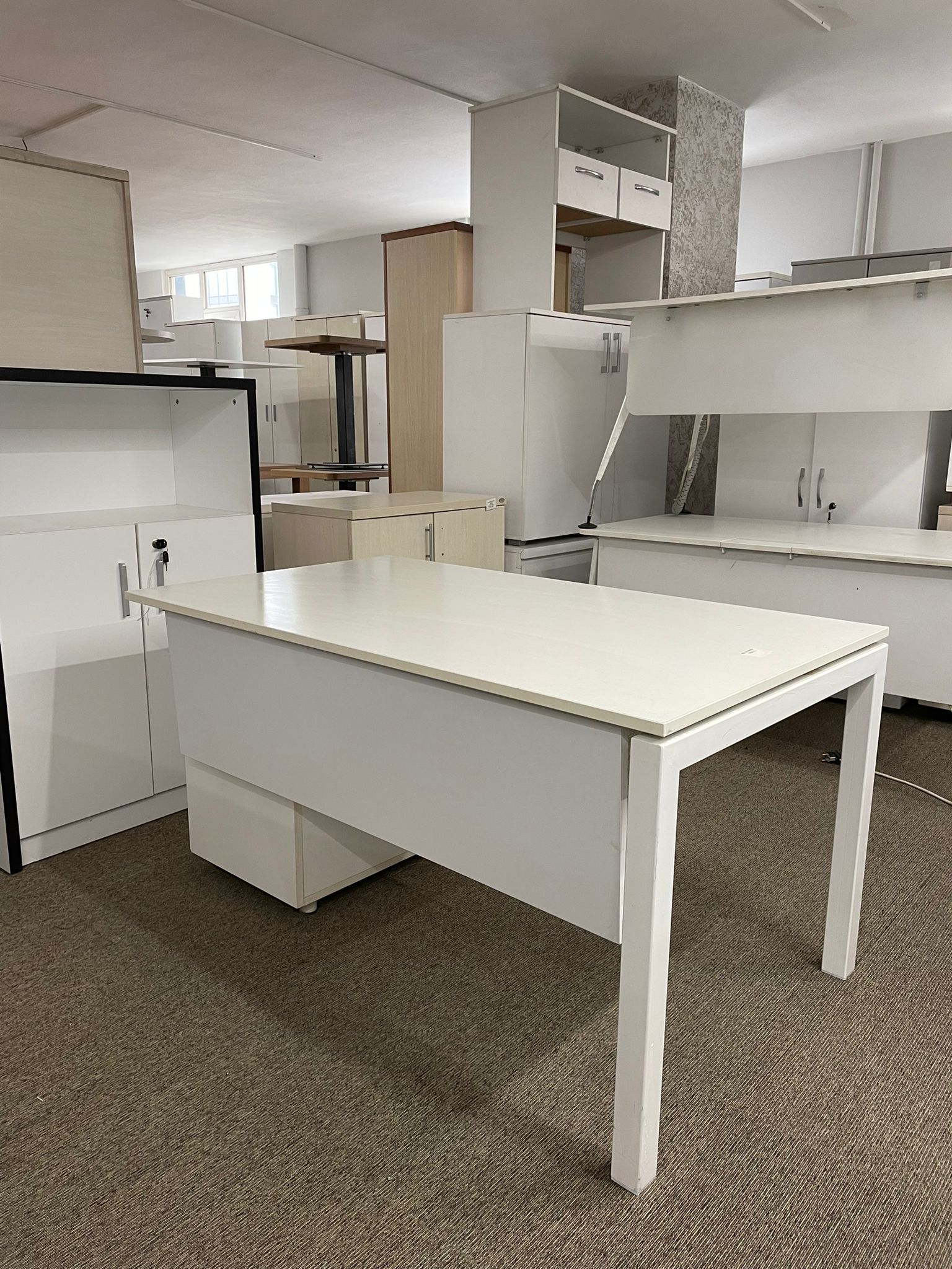 Açıklama: Beyaz rengin ferahlığını ve modern tasarımını bir araya getiren, 140×80 cm ideal ölçülerinde bireysel çalışma masası setidir. Yanında bulunan keson ünitesi sayesinde evraklar ve kişisel eşyalar için düzenli bir depolama alanı sunar. 80 cm derinliği ile geniş bir çalışma yüzeyi sağlar, bilgisayar ve ekipmanlar için konforlu bir yerleşim imkanı tanır. İskelet yapısı sağlam, keson çekmeceleri sorunsuz çalışmakta ve tüm parçaları eksiksiz durumdadır.