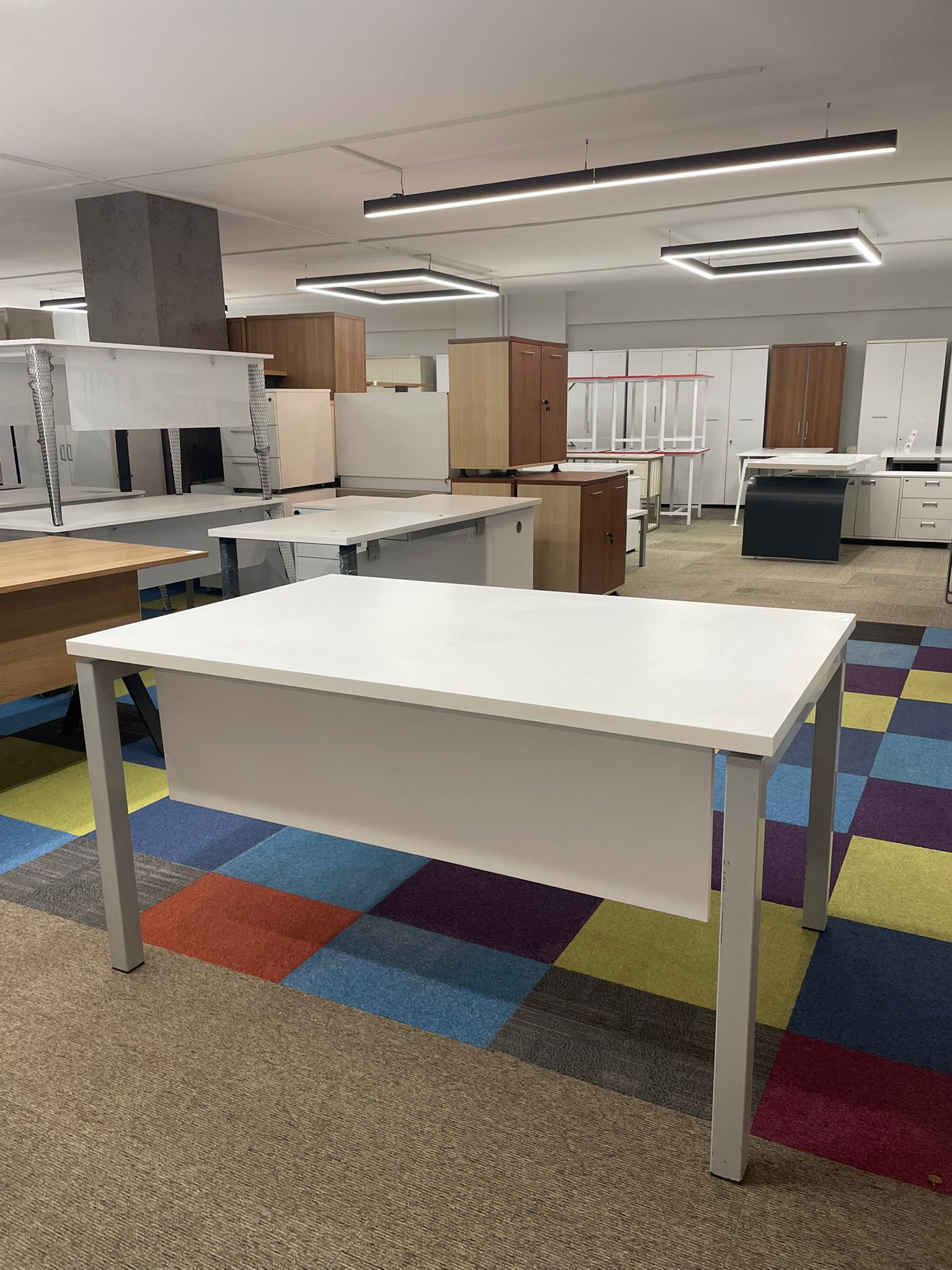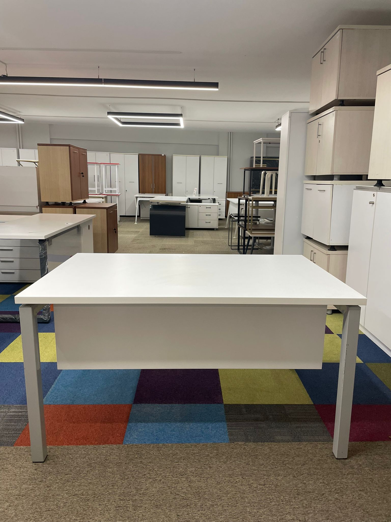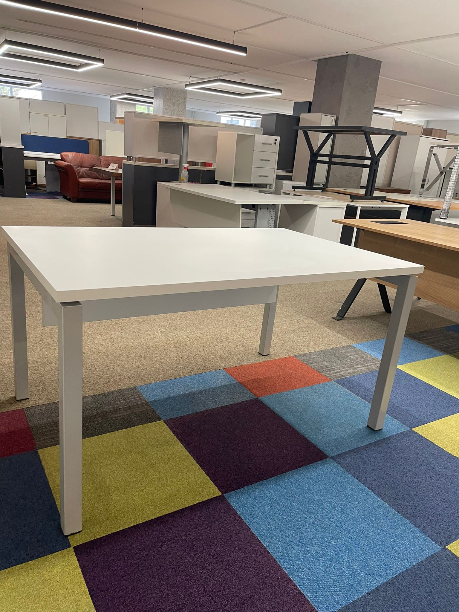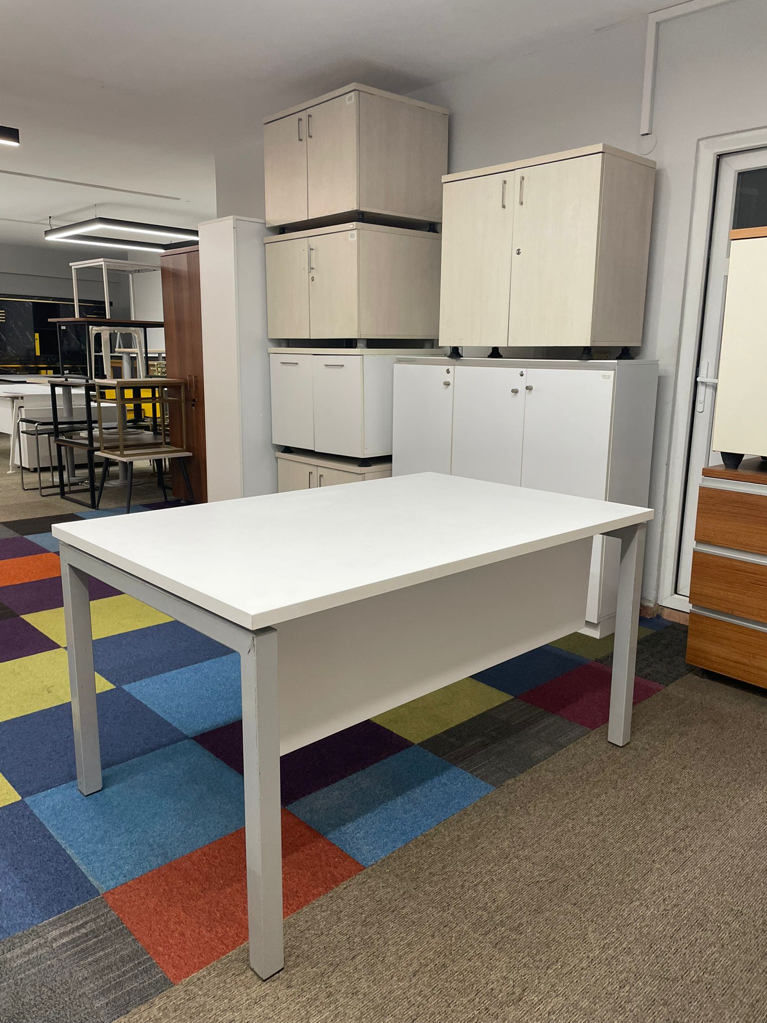 Kullanım Alanı: Modern Ofisler / Tasarım Ofisleri / Home-Office / Toplantı Masası (Küçük Ölçekli) Açıklama: 140×90 cm ölçüleriyle alışılmışın dışında bir derinlik sunan, oldukça kullanışlı ve ferah bir çalışma masasıdır. 90 cm derinliği sayesinde monitör, evrak ve diğer ofis ekipmanları için ekstra geniş alan sağlar. Beyaz tablanın modernliği ile metal ayakların sağlamlığı birleşerek hem estetik hem de sarsılmaz bir yapı oluşturur. İkinci el olmasına rağmen tabla yüzeyi oldukça temizdir ve metal iskeleti ilk günkü sağlamlığını korumaktadır.