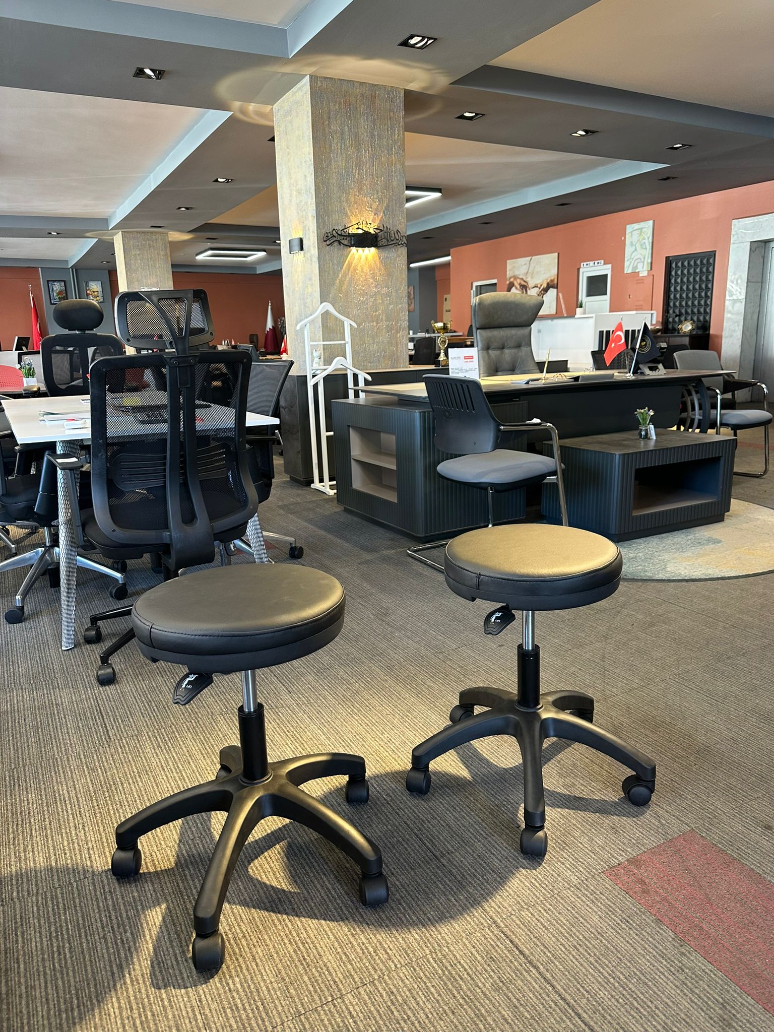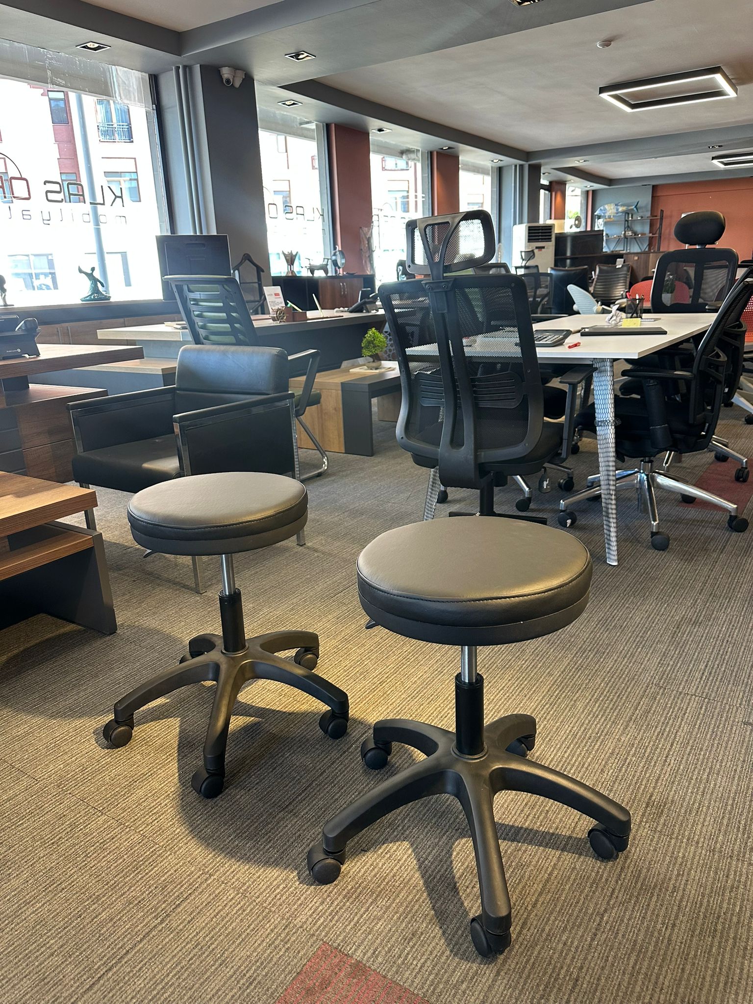 Açıklama: Hareket kabiliyeti yüksek, 360 derece dönebilen tekerlekli mekanizmaya sahip sıfır servis sandalyesidir. Kompakt tasarımı sayesinde dar alanlarda rahat hareket imkanı sunar. Yükseklik ayarlı (amortisörlü) yapısı ile farklı masa boylarına ve kullanıcı boyuna göre kolayca optimize edilebilir. Sırt desteği ergonomik olup, uzun mesai saatlerinde konforu korumak için tasarlanmıştır. Dayanıklı kumaş/deri döşemesi ve sağlam yıldız ayak sistemi ile uzun ömürlü bir kullanım sunar.